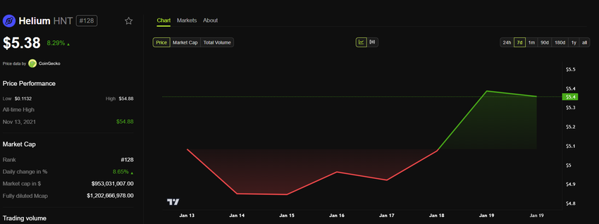 Siitä huolimatta, rahoitusvalvojan oikeustoimet eivät ole vaikuttaneet Heliumin Solanaan perustuvaan HNT-tokeniin. Digitaalinen omaisuus on noussut noin 10 % viimeisen 24 tunnin aikana ja on 5,39 dollaria lehdistöhetkellä, BeInCrypto-tietojen mukaan.