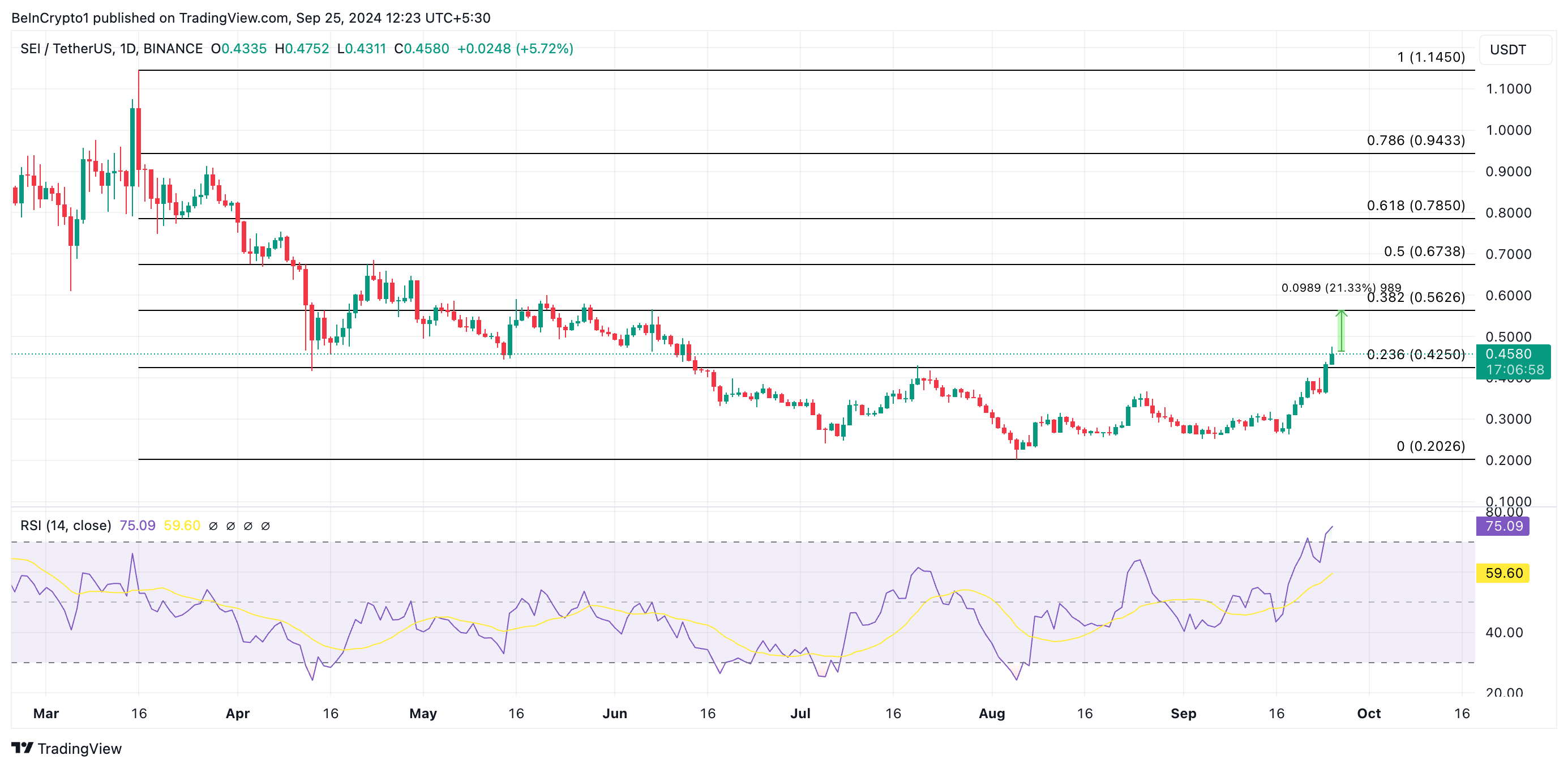 SEI on kokenut huomattavan nousun, ja sen hinta on hypännyt 25% viimeisen 24 tunnin aikana, nousten 0,45 dollariin — korkeimmalle tasolleen sitten kesäkuun 7. päivän.