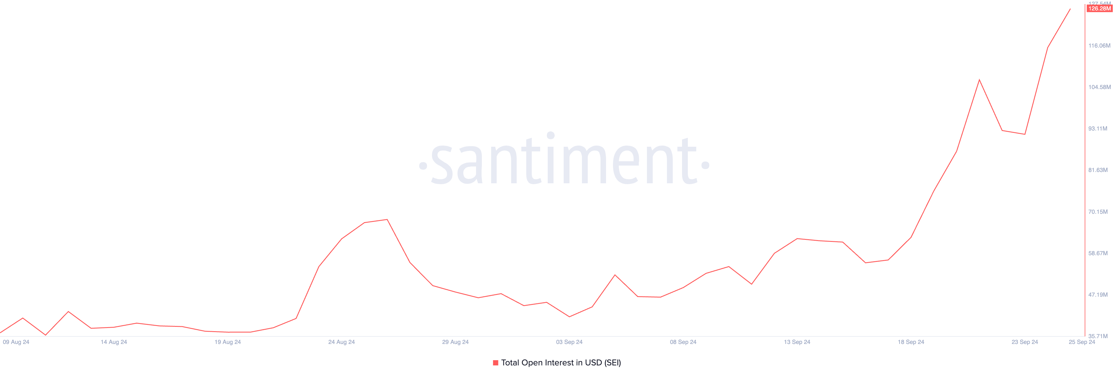 SEI:n kaksinumeroinen hintaralli on kiihdyttänyt kaupankäyntiaktiivisuutta sen johdannaismarkkinoilla, mikä näkyy merkittävänä nousuna Open Interestissä. Tällä hetkellä Open Interest, joka kuvaa kaikkien avoimien futuuri- tai optiosopimusten kokonaismäärää, on 126,28 miljoonaa dollaria — korkein taso sitten huhtikuun.
