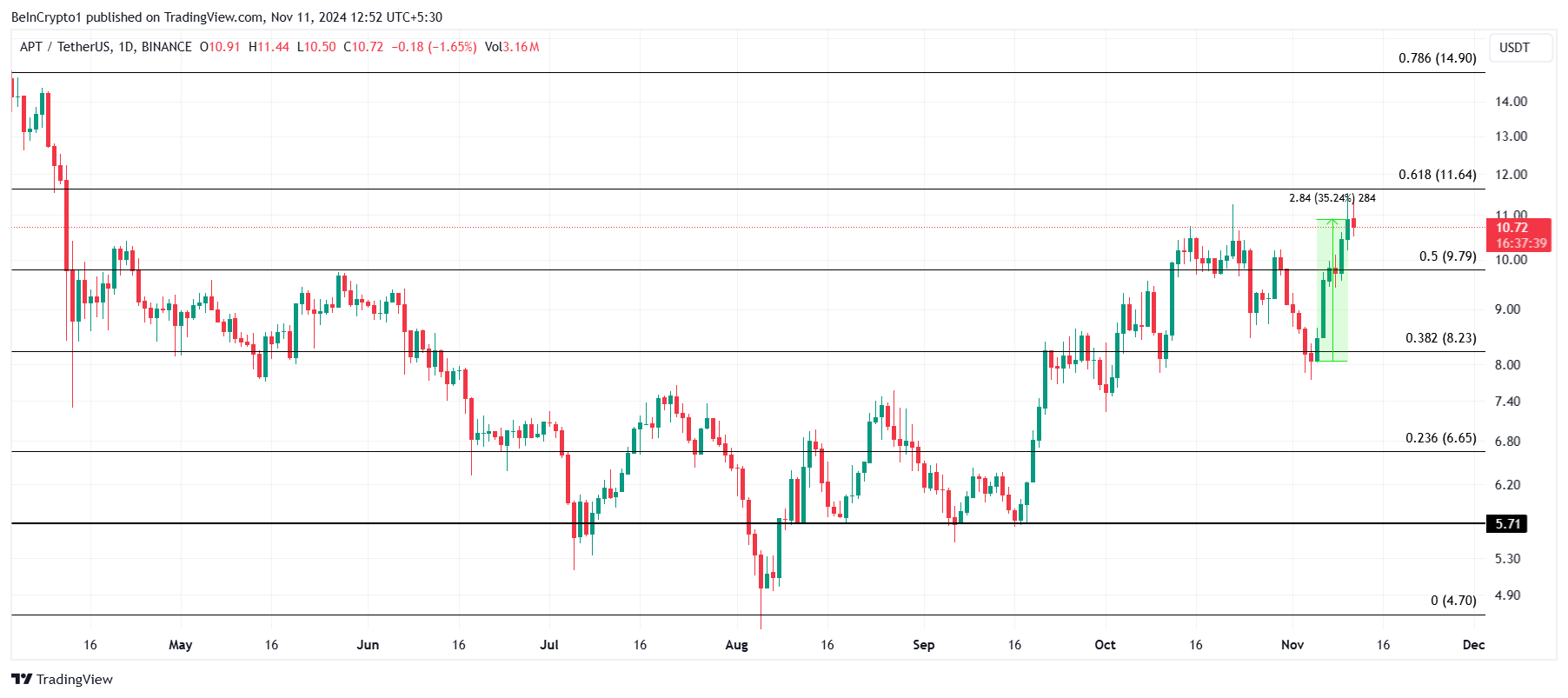 Aptos hyötyy vahvasta härkäviikosta, ja sen hinta on noussut 35 % saavuttaen 10,72 dollaria. Altcoin nyt pyrkii vakiinnuttamaan 61,8 %:n Fibonacci-tason 11,64 dollaria tukena, mikä voisi vahvistaa sen ylöspäin suuntautuvaa liikettä ja houkutella lisää sijoittajia.