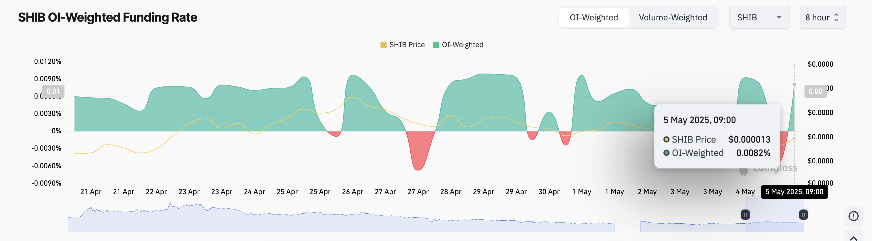 Kun korko on positiivinen, pitkät kauppiaat maksavat lyhyille kauppiaille. Tämä osoittaa, että noususuuntainen tunnelma on hallitseva SHIB-futuurikauppiaiden keskuudessa, sillä kysyntä pitkille positioille on suurempi.
