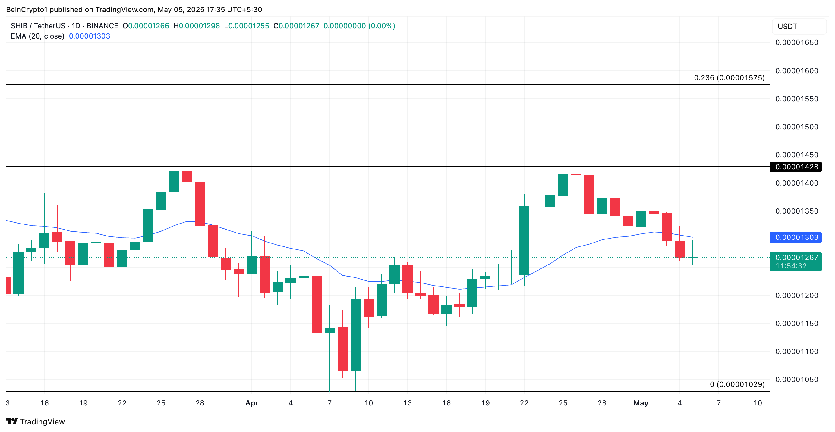 Jatkuvan elpymisen aloittamiseksi SHIB:n on kuitenkin ensin ylitettävä keskeinen vastustaso—20 päivän eksponentiaalinen liukuva keskiarvo (EMA). Tämä muodostaa esteen kolikon hinnan yläpuolella 0,000013 dollarissa.