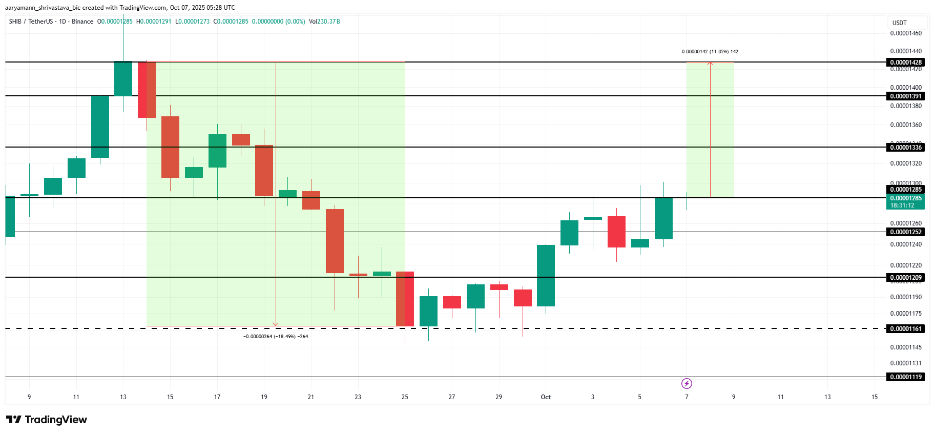 Kirjoitushetkellä Shiba Inu käy kauppaa hintaan 0,00001285 dollaria, pyrkien vakiinnuttamaan tämän tason vahvaksi tueksi. Meemikolikko on nyt 11 % päässä täydellisestä toipumisesta syyskuussa kirjatuista 18 % tappioista. Nykyisen suuntauksen ylläpitäminen voisi auttaa SHIB:ia vahvistamaan elpymisrakennettaan.