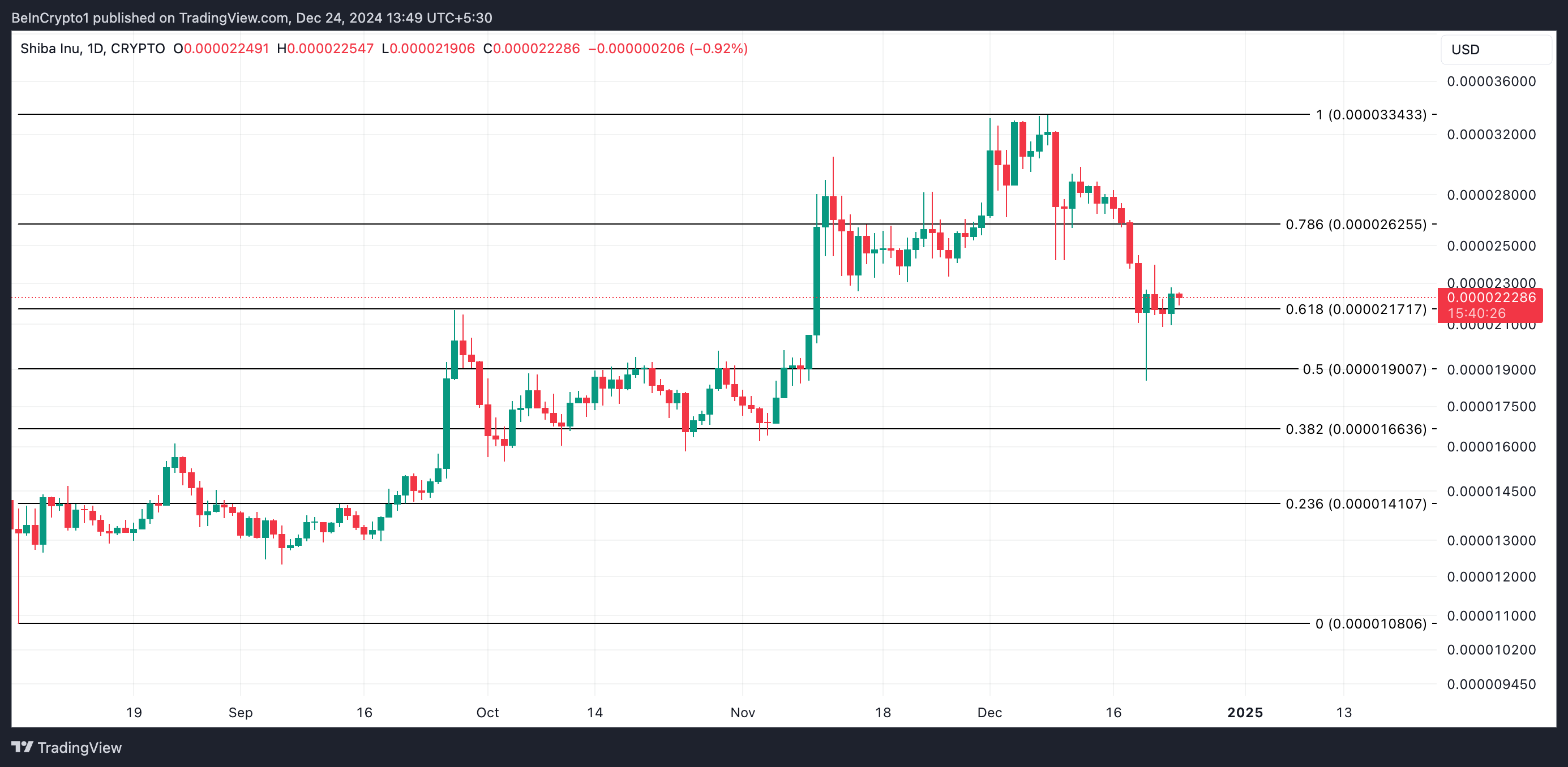 SHIB:n hinta on tällä hetkellä 0,000022 dollaria, ja se pysyy tukitason 0,000021 dollaria yläpuolella. Kun karhumarkkinan paine kasvaa, SHIB voi kokea laskun tälle tukitasolle. Jos härät eivät pysty puolustamaan sitä, laskutrendi voi voimistua, mikä laskee SHIB:n hinnan 0,000019 dollariin.