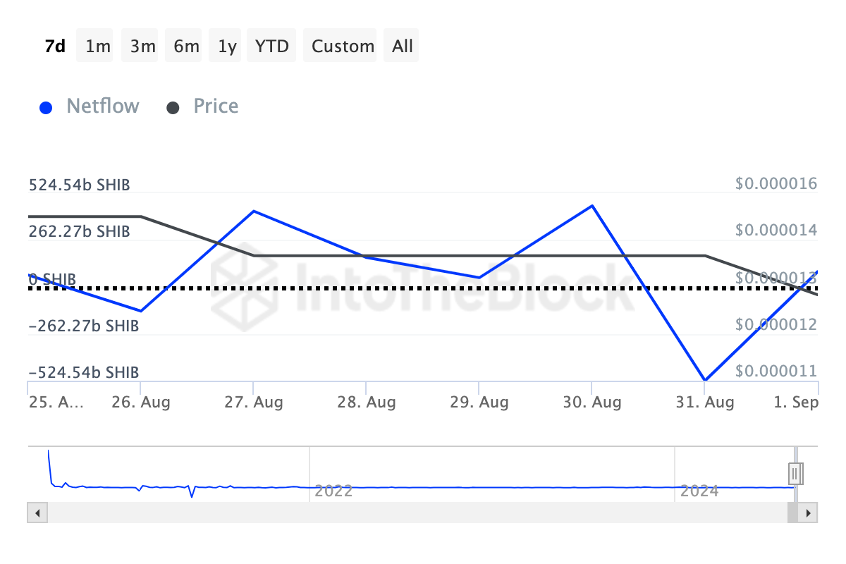 Kun suurten omistajien nettovirta kasvaa, se tyypillisesti viestii siitä, että SHIB:iä ostetaan enemmän kuin myydään, mikä voi johtaa hinnan nousuun. SHIB:n kohdalla tapahtuu kuitenkin päinvastoin.