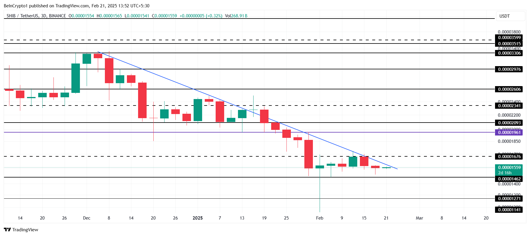 Shiba Inun hinta on tällä hetkellä 0,00001559 dollaria, ja se on lähellä murtautumista ulos laskusuunnasta, joka on jatkunut joulukuusta 2024. Tämä mahdollinen läpimurto riippuu nykyisten hintatasojen säilyttämisestä ja keskeisten vastusalueiden murtamisesta. Onnistunut nousu yli 0,00001676 dollarin laukaisisi hintarallin kohti 0,00001961 dollaria.