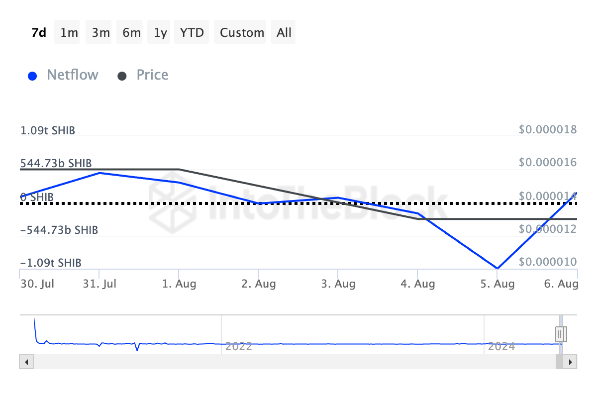 Kun laajempi markkina kamppailee laskusuhdanteen kanssa, SHIB:n valaat ovat vähentäneet omistuksiaan. Tämä voidaan päätellä meemikolikon suurten omistajien netflow’n 67% laskusta viimeisen seitsemän päivän aikana.