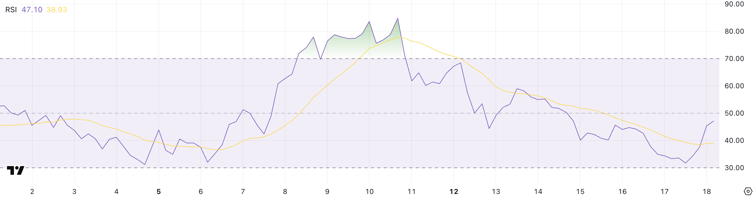 Relative Strength Index (RSI) mittaa hintaliikkeiden nopeutta ja muutosta, vaihdellen 0:sta 100:aan. Yli 70:n lukemat viittaavat yleensä yliostettuihin olosuhteisiin, kun taas alle 30:n arvot viittaavat siihen, että omaisuusvara saattaa olla ylimyyty.