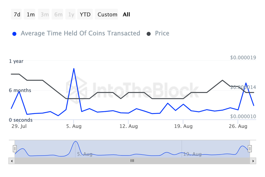 tyypillisesti, kun Coin Holding Time vähenee, se viittaa siihen, että omistajat ovat luopumassa kryptovaluutasta, mikä voisi johtaa hinnan laskuun. kuitenkin, pidennetty omistusaika viittaa kasvavaan luottamukseen omaisuusvaran keskipitkään ja pitkään potentiaaliin. Shiba Inulle (SHIB) tämä lisääntynyt omistusaika voisi tarjota jonkin verran hintavakautta, jos se säilyy.