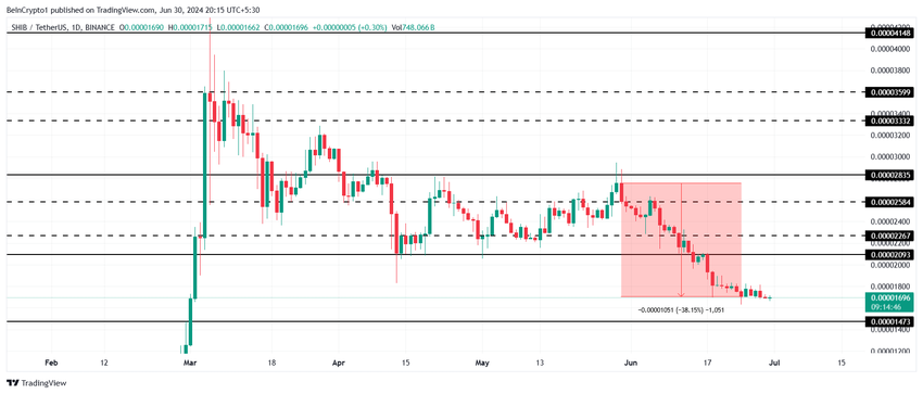 Shiba Inun hinta, jonka arvo on 0,00001696 dollaria, kärsii kesäkuun aikana havaitusta lähes 40 prosentin laskusta. Kun meemikolikko putosi konsolidointivyöhykkeeltä 0,00002584–0,00002267 dollarin välillä, se loi tilaa tappioille.