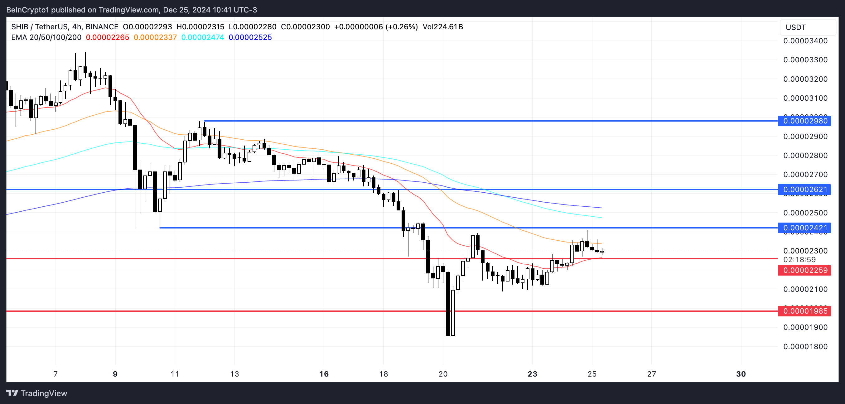 SHIB-hinta käy tällä hetkellä kauppaa tiukassa vaihteluvälissä, jossa vastus on 0,000024 dollaria ja tuki 0,00002259 dollaria, mikä määrittää sen välittömät rajat.