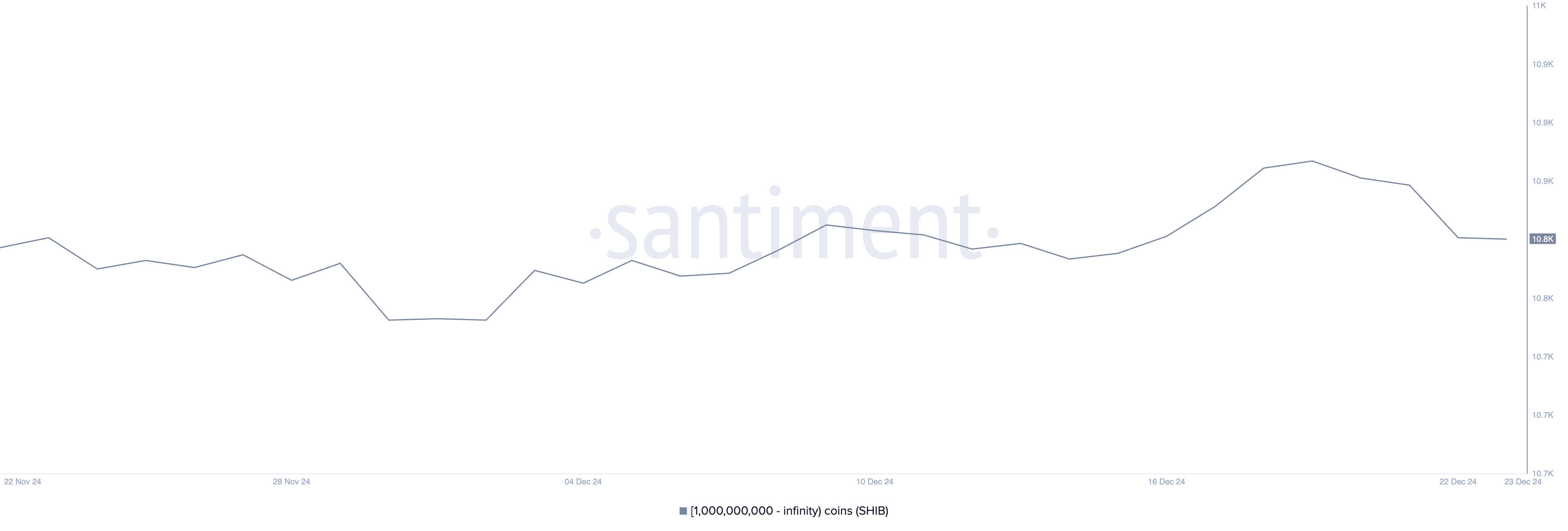 Joulukuun 14. ja 19. päivän välillä vähintään 1 miljardia SHIB:tä omistavien osoitteiden määrä kasvoi 10 861:stä 10 930:een, mikä osoittaa merkittävää kertymistä suurten haltijoiden keskuudessa tänä aikana.