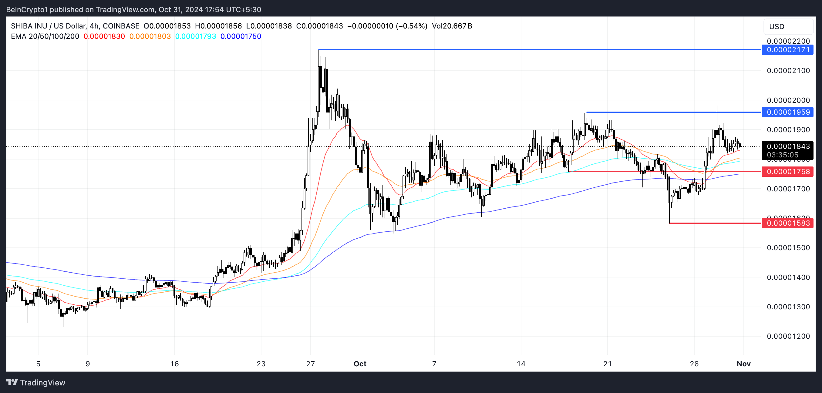 Shiba Inu (SHIB) hinta on tällä hetkellä härkämäisessä asetelmassa, jota tukee sen sijainti kaikkien EMA-viivojen yläpuolella. Kuitenkin liikkuvien keskiarvojen välinen kapea etäisyys viittaa siihen, että härkämäinen vauhti ei ole erityisen vahva.