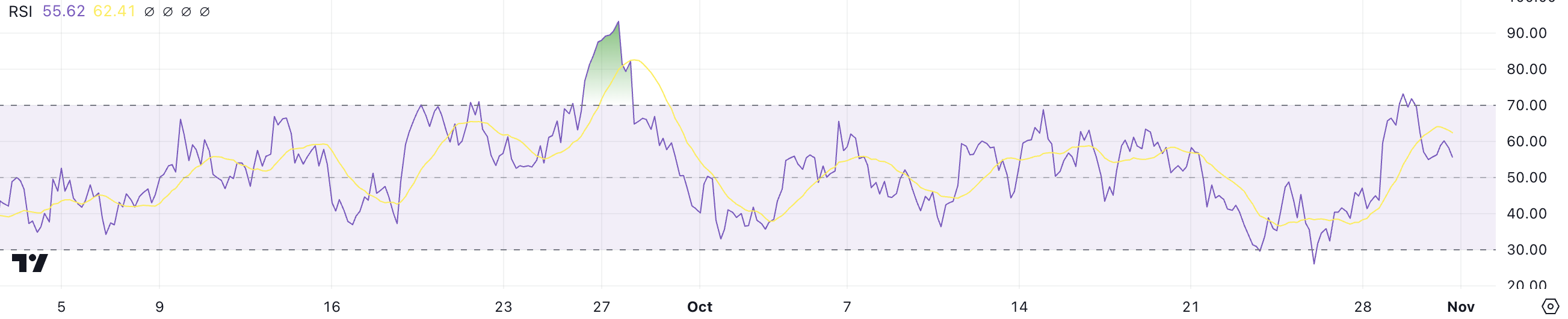 RSI (Relative Strength Index) on keskeinen vauhtia mittaava tunnusluku, joka mittaa hintamuutosten nopeutta ja suuruutta asteikolla 0–100. Se auttaa määrittämään, onko omaisuusvara yliostettu (yli 70) tai ylimyyty (alle 30). SHIB:n RSI:n ollessa 55,62, se sijaitsee tällä hetkellä neutraalimmalla alueella.