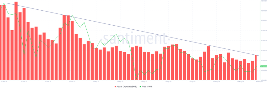 Kasvava luottamus nousuun näkyy niiden toiminnassa ja aktiivisten talletusten vähenemisenä. Aktiiviset talletukset viittaavat yksilöllisiin osoitteisiin, jotka siirtävät SHIB:n lompakoista pörssitalletuksiin. Tämän mittarin piikki on myös synonyymi lisääntyneelle myyntipaineelle.