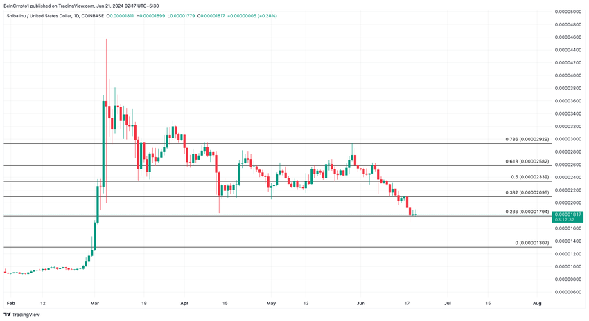 Tämä on myös alue, jossa 0, 382 Fibonacci-taso sijaitsee. Samaan aikaan Lookonchain paljasti, että valas keräsi 6.60 miljoonan dollarin arvosta SHIB: tä 20. kesäkuuta.