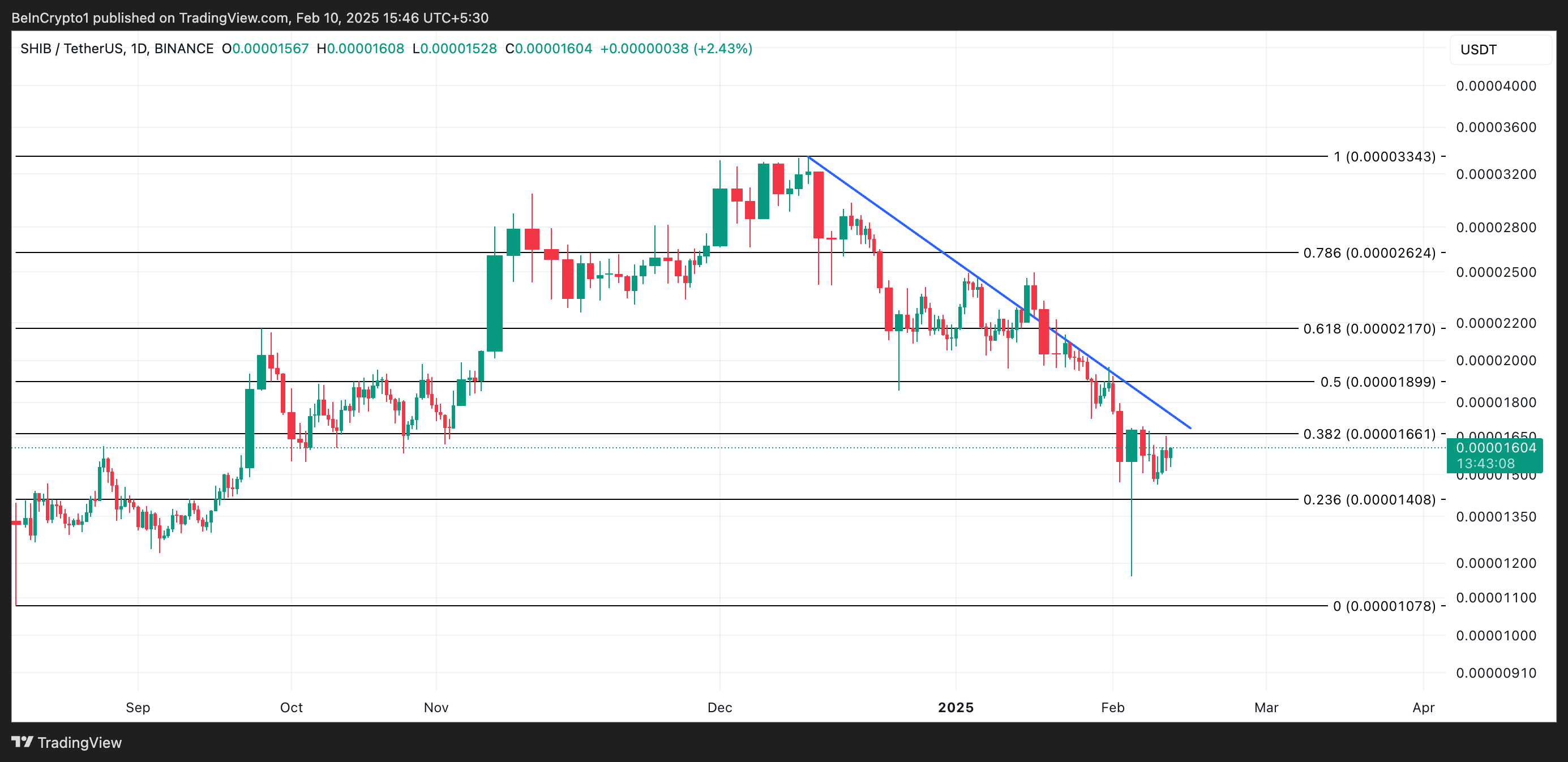 Päivittäisessä kaaviossa SHIB:n hinta pysyy laskevan trendiviivan alapuolella, jonka alapuolella se on käynyt kauppaa joulukuun 9. päivästä lähtien. Tämä on laskeva kuvio, joka muodostuu, kun omaisuusvaran hinta luo ajan myötä matalampia huippuja, mikä viittaa laskusuuntaan markkinoilla.
