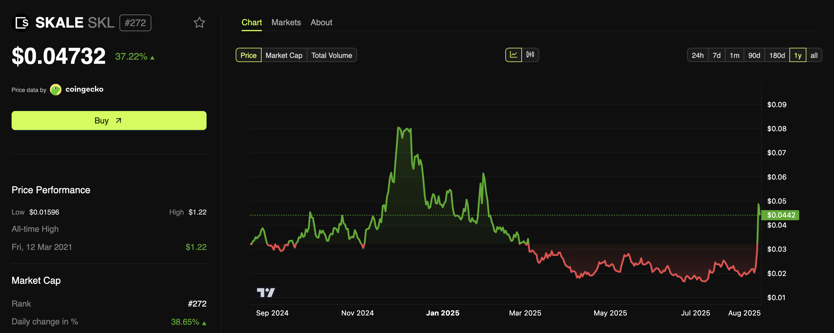 Altcoin myös uhmasi laajempaa markkinakorjausta ja nousi 37,22 % edellisen päivän aikana. Kirjoitushetkellä SKL:n hinta oli 0,047 dollaria.