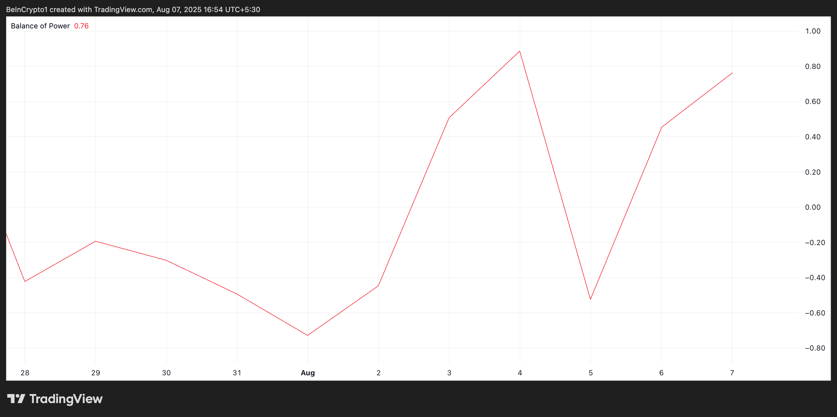 Esimerkiksi sen Balance of Power (BoP) on positiivinen tätä kirjoitettaessa, mikä osoittaa, että suuntaus on tällä hetkellä härkien eduksi. Se on tällä hetkellä nousutrendissä ja on 0,76.