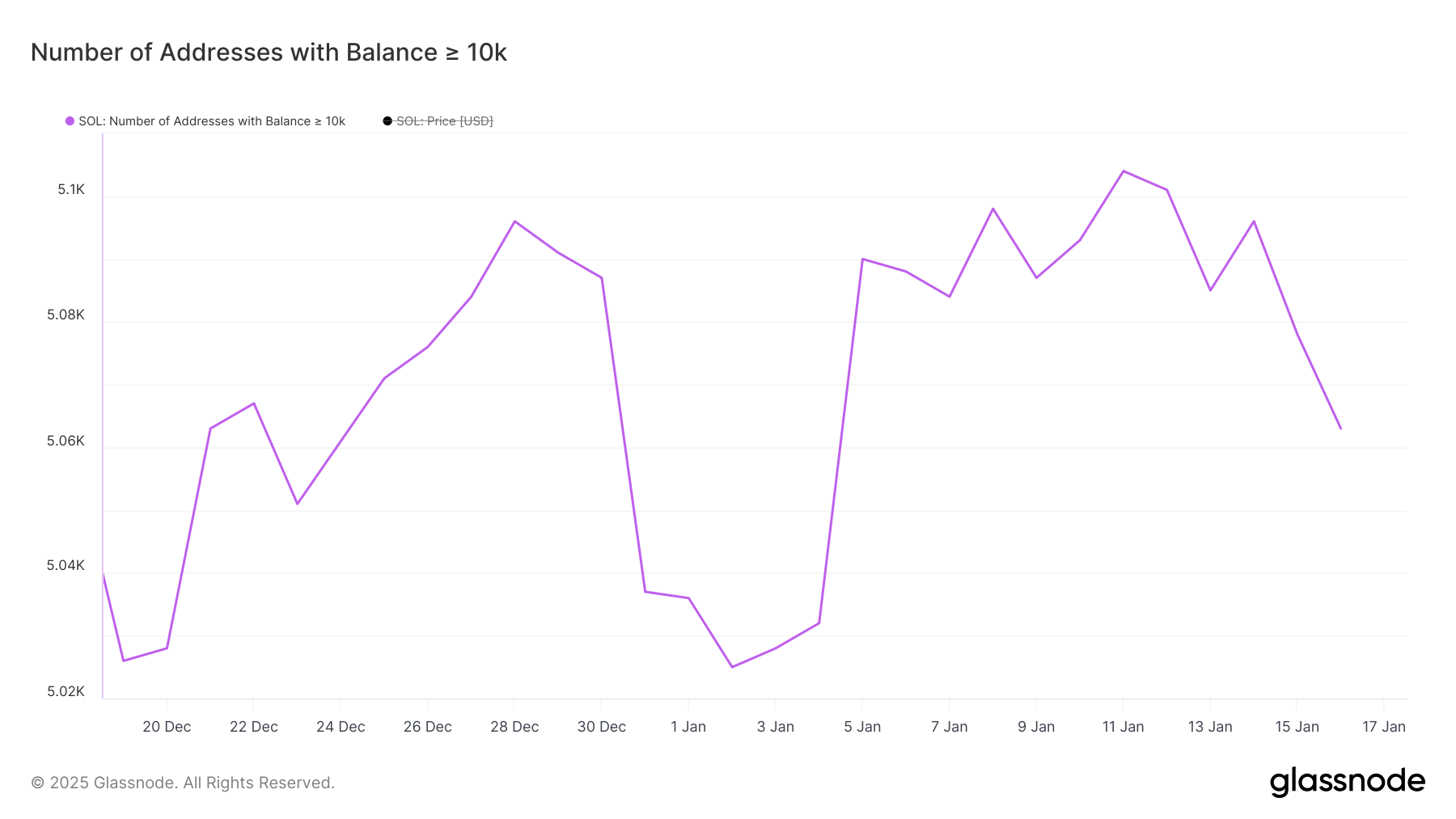 Osoitteiden määrä, jotka pitävät vähintään 10 000 SOL, kasvoi merkittävästi 4. tammikuuta ja 5. tammikuuta välillä, nousten 5 032:sta 5 090:een. Tämä noususuunta jatkui joillakin vaihteluilla, saavuttaen kaikkien aikojen korkeimman tason 5 104 11. tammikuuta.