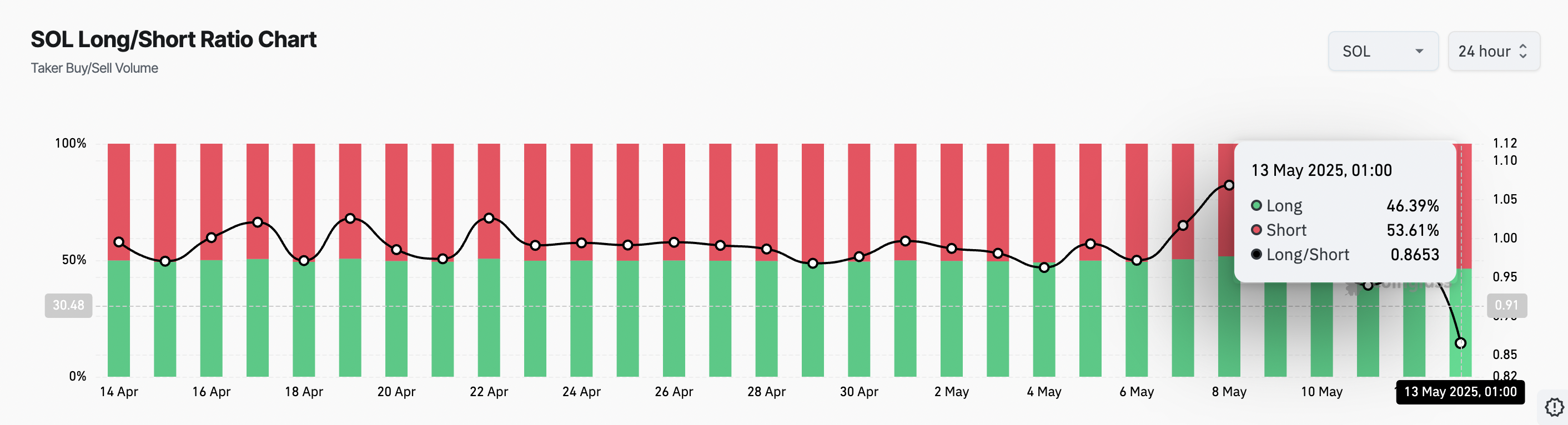 Coinglassin tietojen mukaan Solanan long/short-suhde on pudonnut 0,86:een, mikä on alhaisin taso viimeisten 30 päivän aikana. Tämä lasku osoittaa, että karhumarkkinan tunnelma on korkeimmillaan kuukauteen, ja kauppiaat suosivat yhä enemmän short-positioita longien sijaan.