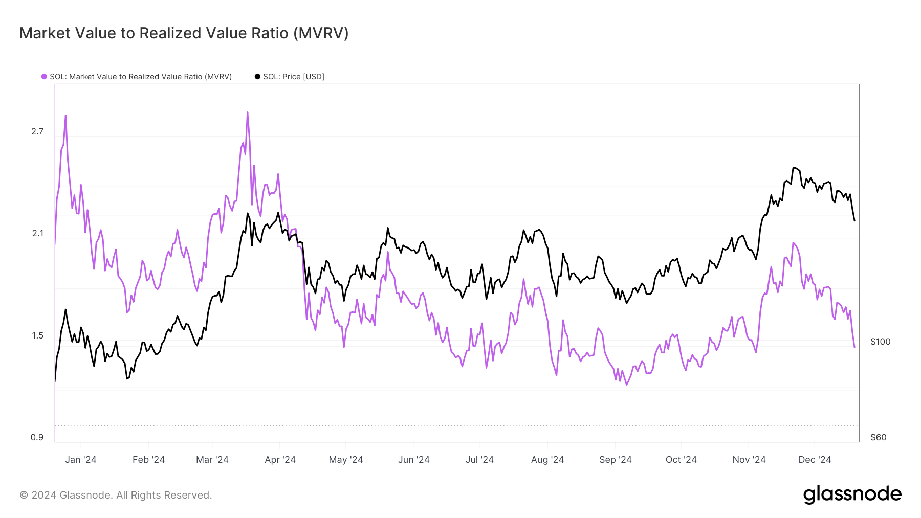 Glassnoden tietojen mukaan Solanan MVRV-suhde on tällä hetkellä 1,45, lähestyen aliarvostettua aluetta. Historiallisesti SOL-hinta pyrkii saavuttamaan markkinoiden huipun, kun sen MVRV-suhde saavuttaa noin 2,83.