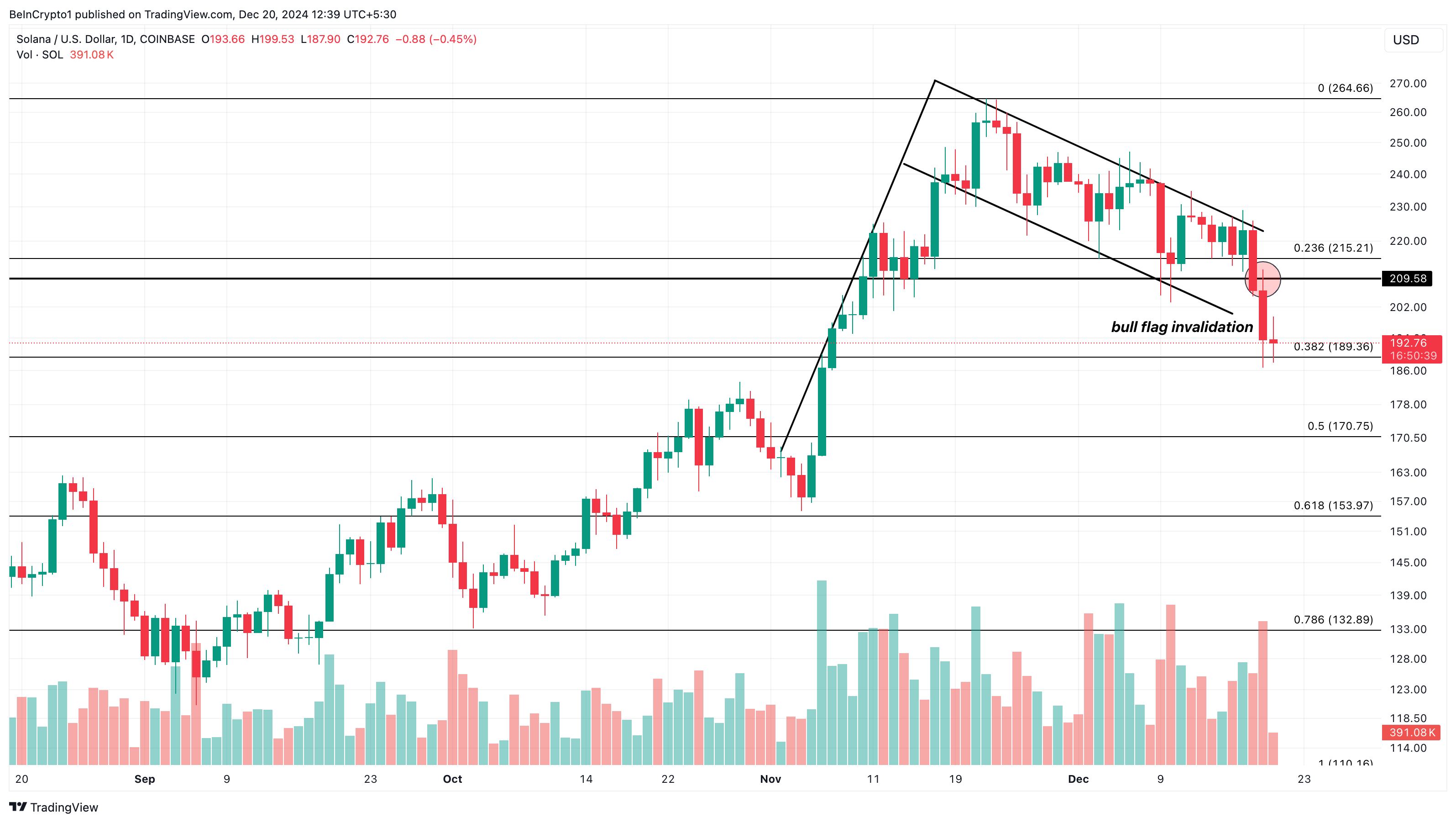 Solana on aiemmin muodostanut bull flagin, joka vihjasi mahdollisesta noususta 300 dollariin. Kuitenkin tämän päivän arvio päivittäisestä kaaviosta osoittaa, että näkymä on mitätöity, koska SOL-hinta laski tukilinjan alapuolelle 209,58 dollariin.