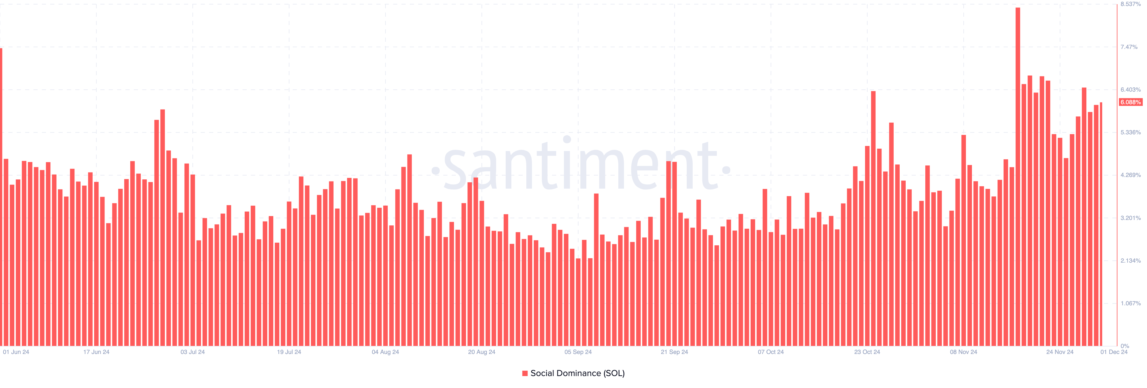 Sosiaalisen dominanssin nousu osoittaa lisääntynyttä keskustelua omaisuusvarasta, kun taas lasku viittaa siihen, että markkinoiden huomio on siirtynyt muihin kryptovaluuttoihin. Santimentin mukaan Solanan sosiaalinen dominanssi on tällä hetkellä 6,09 %, mikä heijastaa merkittävää kiinnostusta ja aktiivisia keskusteluja omaisuusvarasta.