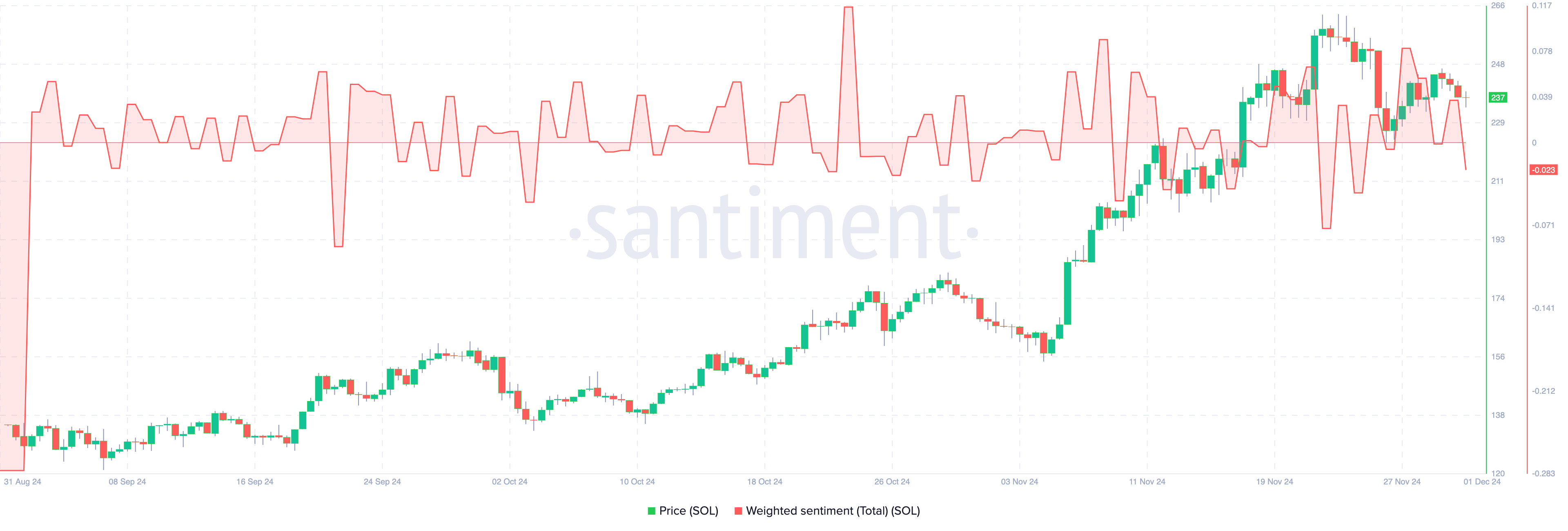 SOL:n näkymistä Brian Quinlivan, Santimentin pääanalyytikko, ehdottaa, että kryptovaluutan laskeva tunnelma voi merkittävästi vaikuttaa sen suorituskykyyn joulukuussa.