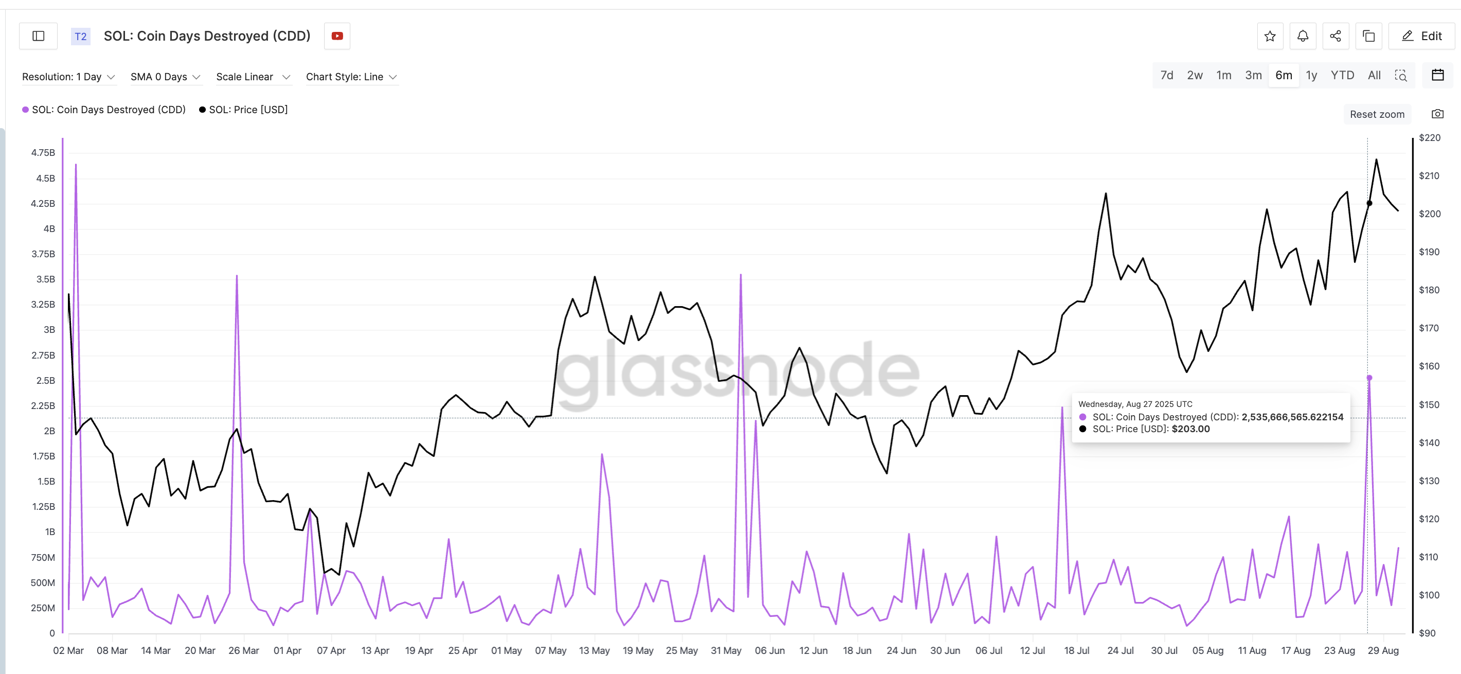 Huoli näkyy myös Coin Days Destroyed (CDD) -tunnusluvussa, joka seuraa, kuinka monta vanhempaa kolikkoa liikkuu lohkoketjussa, mahdollisesti viitaten voittojen kotiuttamiseen. Joka kerta, kun CDD on noussut viimeisen kuuden kuukauden aikana, Solanan hinta on korjautunut jyrkästi pian sen jälkeen.