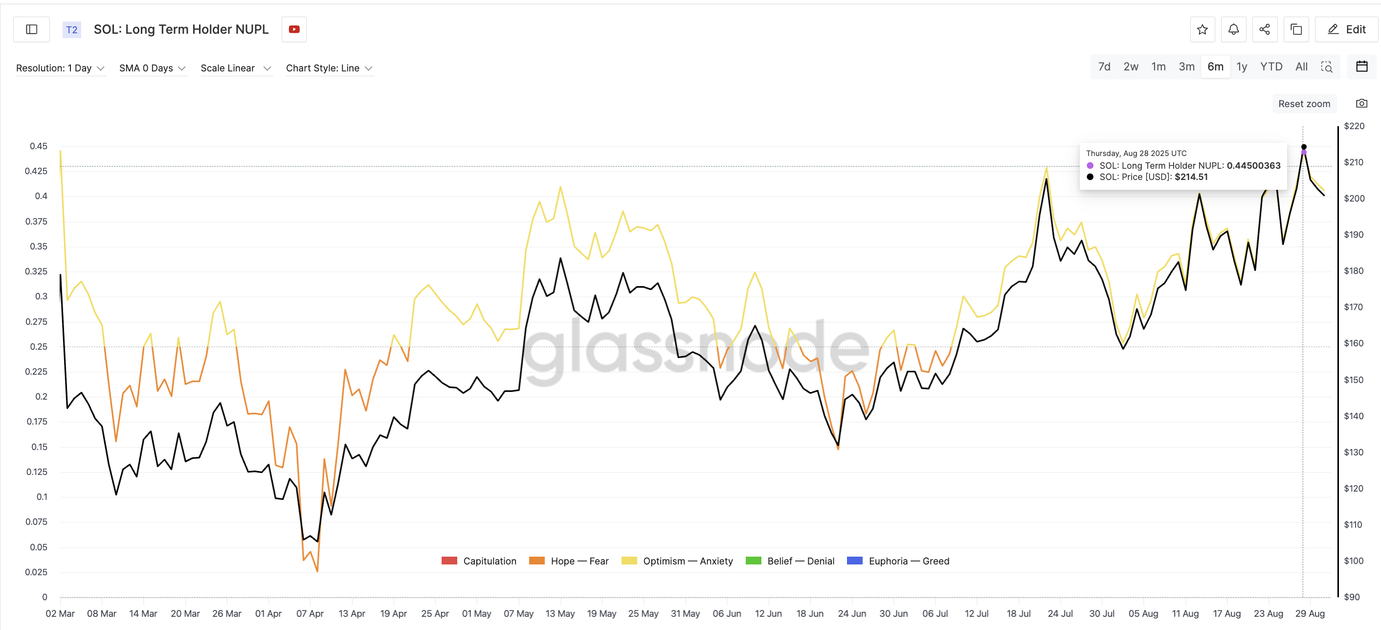 Elokuun 28. päivänä Solanan pitkäaikaisten haltijoiden NUPL saavutti 0,44, mikä on korkein kuuteen kuukauteen ja lähellä maaliskuun 2. päivän huippua 0,4457. Tuota aiempaa piikkiä seurasi jyrkkä lasku, kun Solanan hinta laski 179 dollarista 105 dollariin alle kahdessa viikossa, mikä oli 41 prosentin korjaus. Uudempi esimerkki tuli heinäkuun 22. päivänä, kun 23 prosentin lasku seurasi NUPL:n huippua.