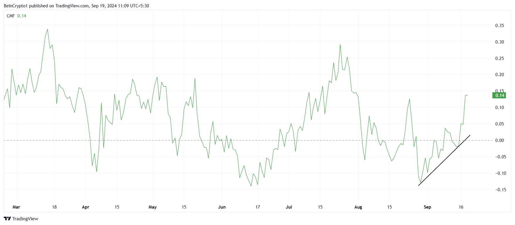 Lisäksi Solanan makrovauhti näyttää vahvistuvan, kuten Chaikin Money Flow (CMF) -indikaattori osoittaa, saavuttaen korkeimman pisteen puolentoista kuukauden aikana. Vaikka nettovirrat olivat pääasiassa negatiivisia syyskuun alussa, viimeiset kolme päivää ovat kääntyneet positiivisiksi, suurelta osin kasvaneen institutionaalisen toiminnan ansiosta.