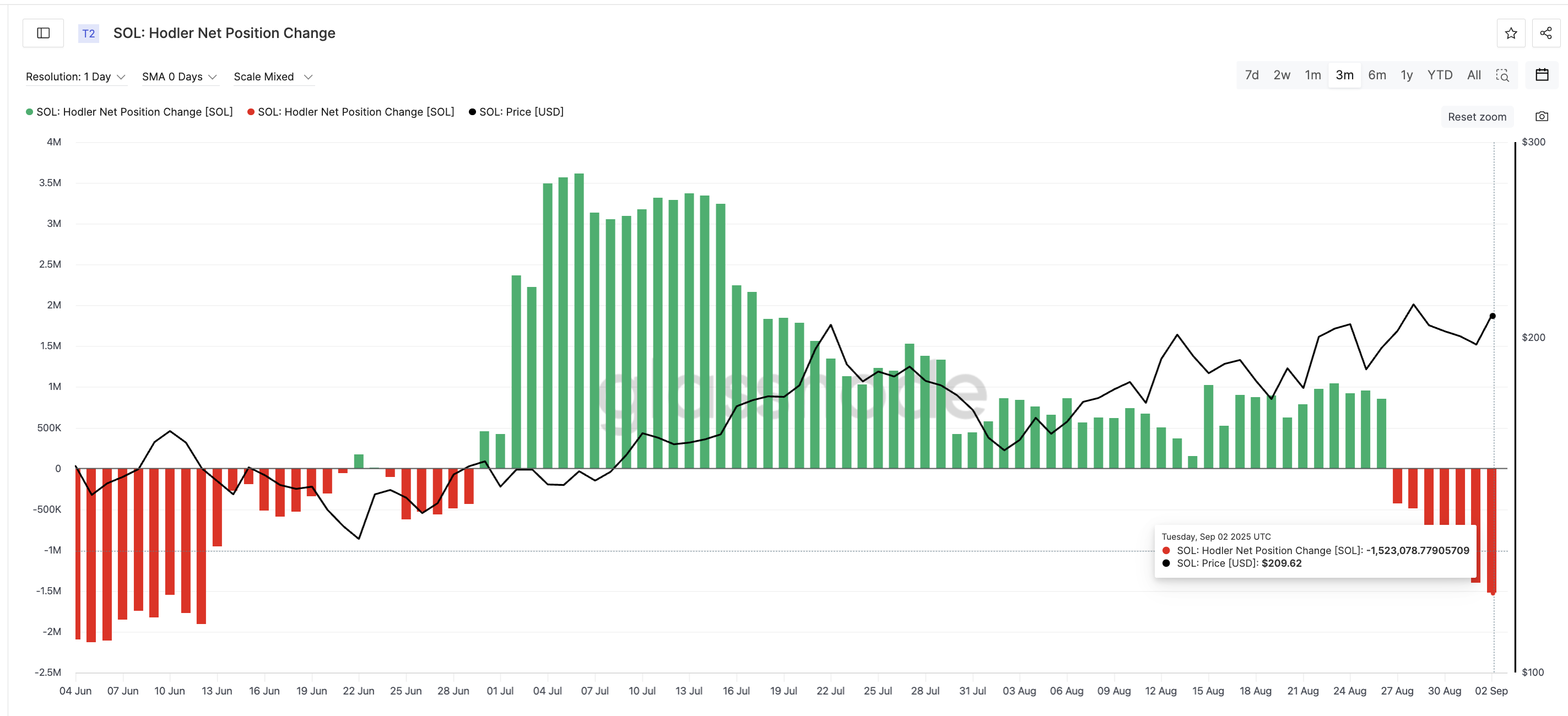 Tällä hetkellä Solanan Hodler Net Position Change on pudonnut jyrkästi punaiselle, alittaen –1,5 miljoonaa SOL. Tämä osoittaa, että pitkäaikaiset sijoittajat vähentävät altistustaan, vaikka hinnat nousevat — laskusuuntainen ero.