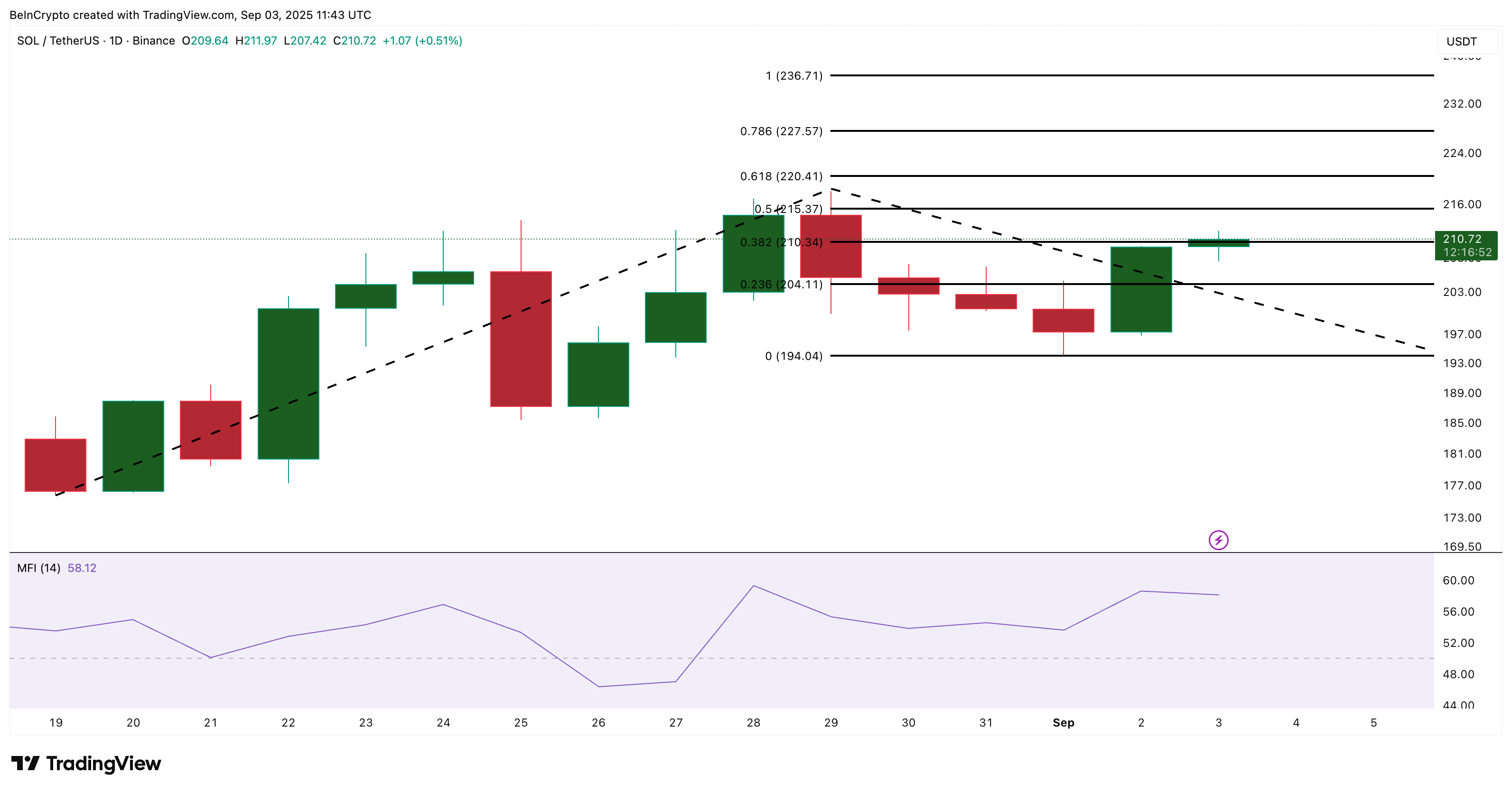 Solana (SOL) käy tällä hetkellä kauppaa hieman yli 210 dollarin, nousua 3,09 % tänään ja lähes 30 % korkeampi kuukausittain. Kuitenkin, huolimatta vahvoista prosentuaalisista nousuista, kauppiaat eivät ehkä ole tunteneet hintarallia täysin. Takaiskut ovat olleet jyrkkiä, ja Solanan hinta on kamppaillut säilyttääkseen suuntauksen, tasoittuen 205–215 dollarin alueelle.
