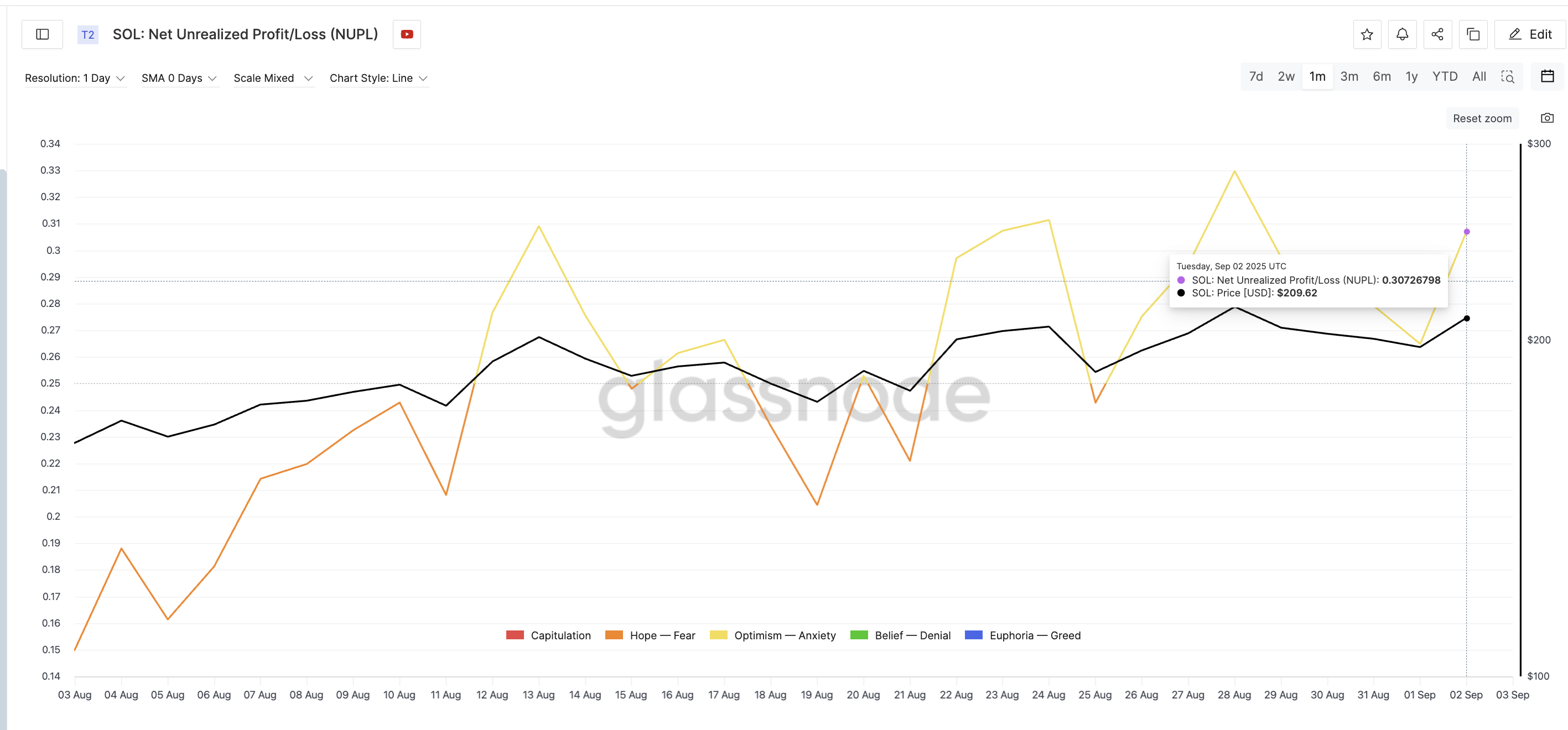 Viimeisen päivän aikana Solanan NUPL on noussut noin 15,4 %, siirtyen 0,26:sta 0,30:een ja muodostaen uuden paikallisen huipun. Aiemmat huiput ovat johdonmukaisesti liittyneet korjauksiin. Elokuun 28. päivänä, kun NUPL saavutti huippunsa, Solana laski 214 dollarista 205 dollariin — pudotus 4,2 %. Aiemmin, elokuun 13. päivänä, NUPL saavutti 0,30, ja hinnat korjautuivat lähes 8 %.