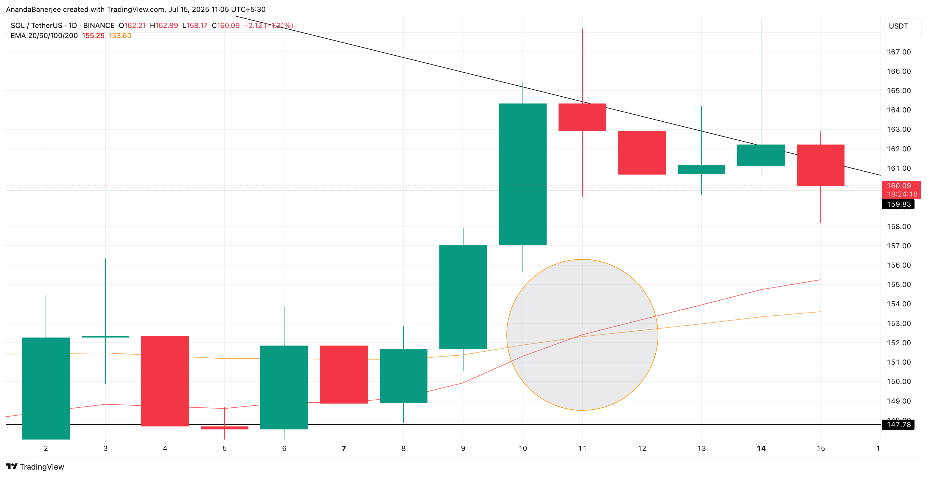 Kuitenkin, selkeä laskeva RSI-erkaantuminen on havaittavissa 10. ja 14. heinäkuuta välillä. SOL-hinta teki korkeamman huipun, mutta RSI teki matalamman huipun; merkki siitä, että tunnelma heikkenee, vaikka SOL-hinta nousee. Tämä erkaantuminen johtaa usein lyhyen aikavälin korjauksiin, joita nyt näemme.