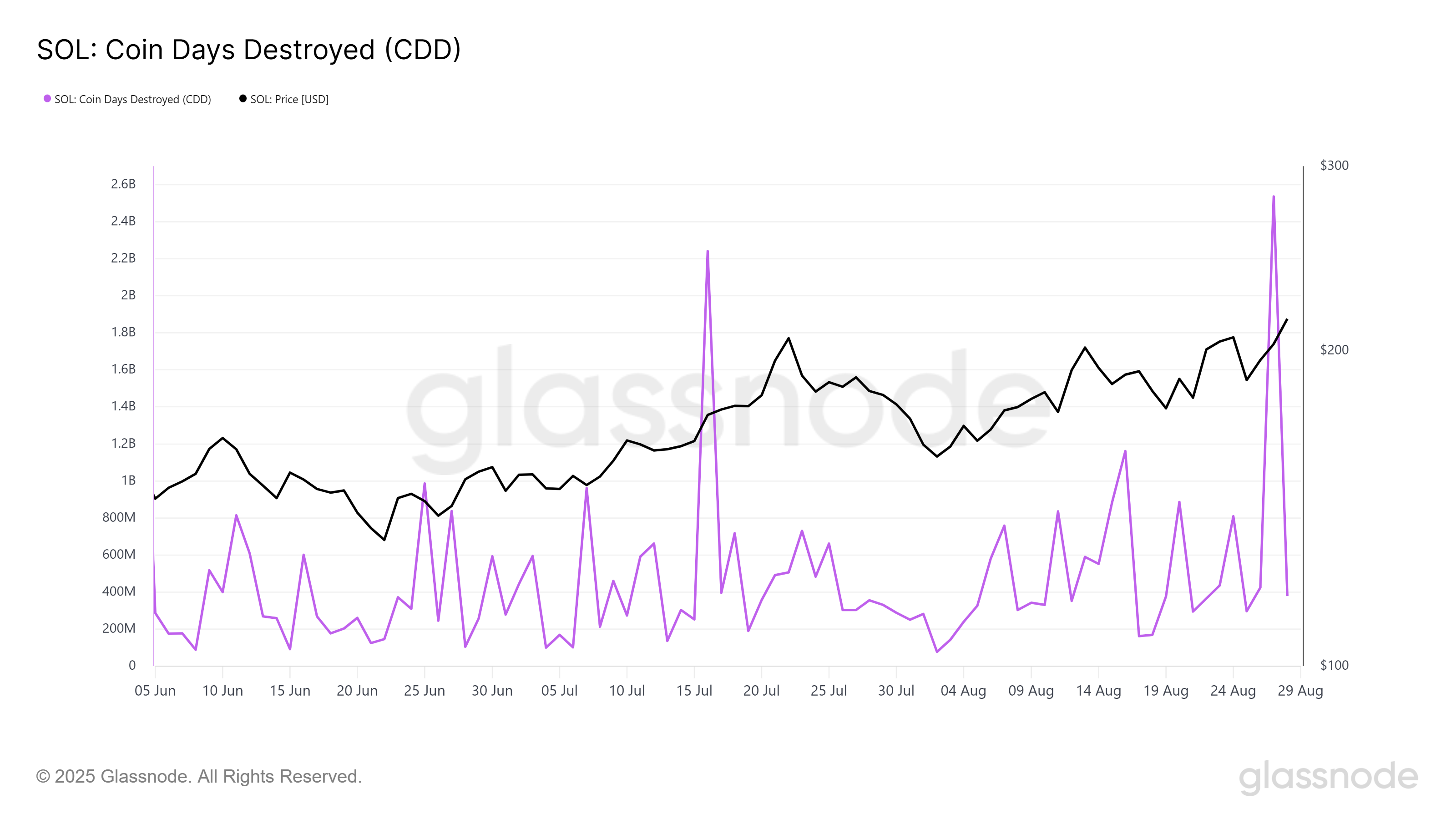 Coin Days Destroyed (CDD) -indikaattori on noussut korkeimmalle tasolleen kolmeen kuukauteen, mikä vahvistaa huolia sijoittajien toiminnasta. Tämä tunnusluku seuraa kolikoiden liikettä pitkäaikaisten haltijoiden keskuudessa, jotka ovat historiallisesti vaikuttaneet Solanan hinnan suuntaan jatkuvan keräämisen tai jakelun kautta.