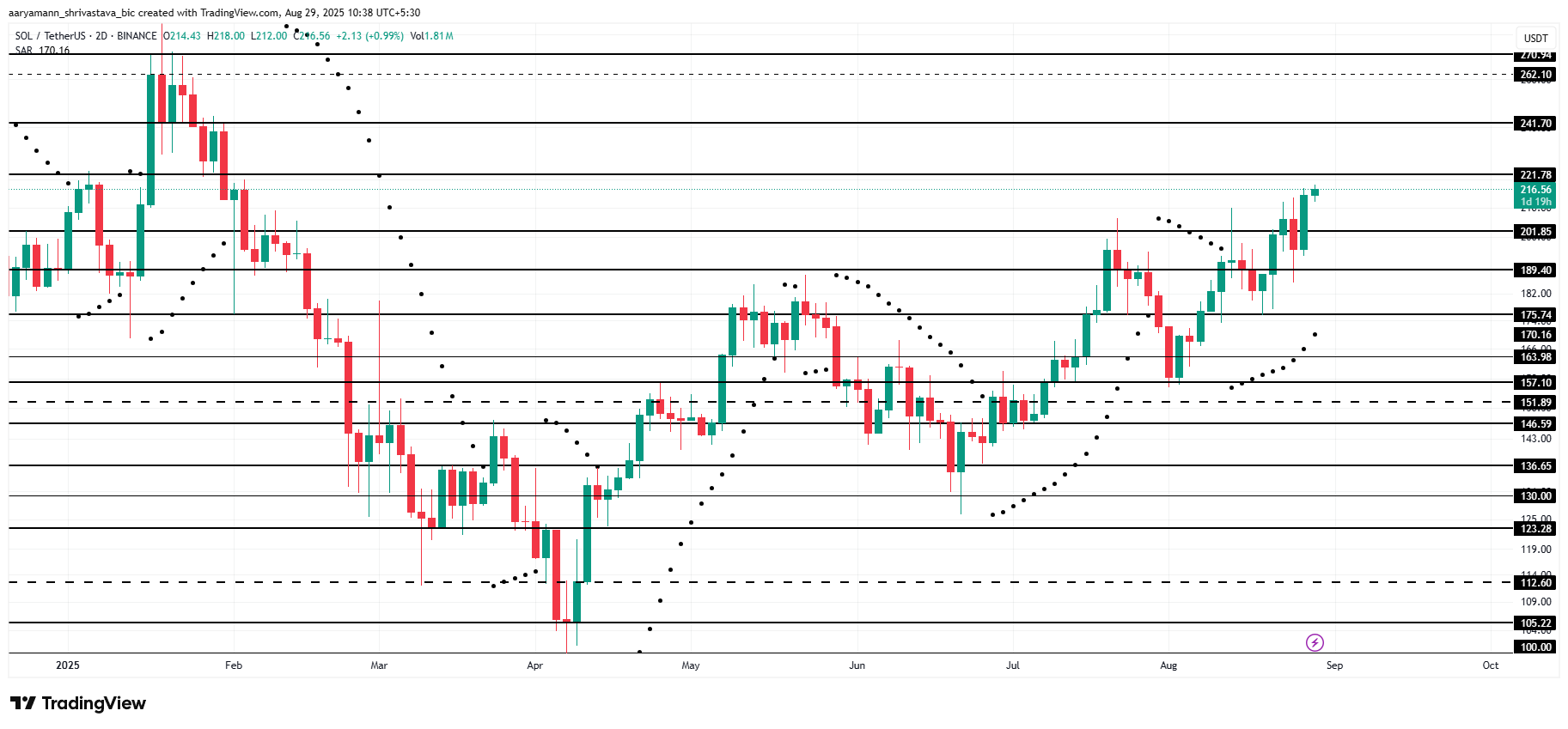 Solana käy kauppaa 216 dollarilla kirjoitushetkellä, juuri vastustustason 221 alapuolella. Viimeisin nousu nosti altcoinin kuuden kuukauden korkeimmalle tasolle. Tämän tason ylittäminen on kriittistä lisäsuuntauksen luomiseksi ja jatkuvan nousutrendin vahvistamiseksi.