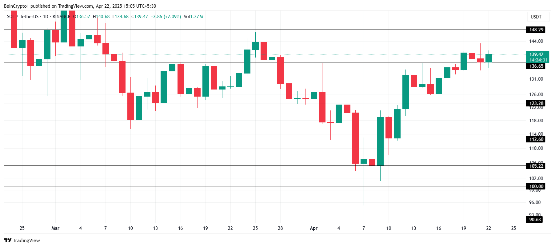 Solana on tällä hetkellä 139 dollarissa, ja tuki pitää vahvasti 136 dollarissa. Tämä on auttanut altcoinia säilyttämään vakauden, vaikka se kohtaa vastustusta 148 dollarissa. Hinta on testannut tätä estettä useita kertoja viimeisten kuuden viikon aikana, mutta ei ole onnistunut ylittämään sitä, mikä merkitsee ratkaisevaa pistettä sen tulevalle suunnalle.