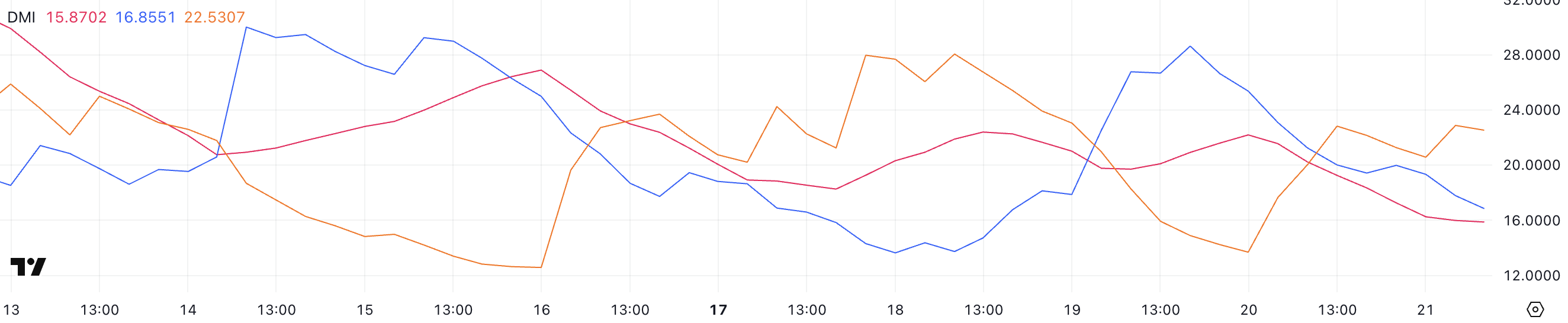Samaan aikaan +DI on pudonnut jyrkästi 16,85:een 28,62:sta, mikä osoittaa härkämäisen tunnelman heikkenemistä. Samaan aikaan -DI on noussut 22,53:een 14,88:sta, mikä viittaa kasvavaan karhumaiseen paineeseen.
