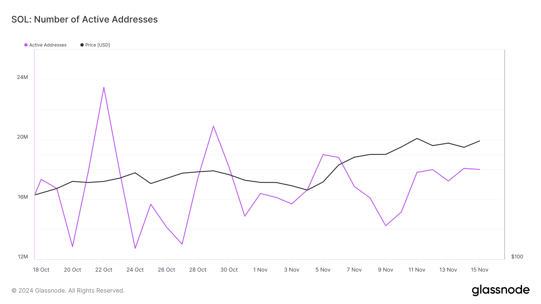 Glassnoden mukaan Solanan aktiiviset osoitteet laskivat yli 20 miljoonasta lokakuun viimeisinä päivinä 17,98 miljoonaan. Jos tämä lasku jatkuu, SOL ei ehkä saa tarpeeksi käyttäjien sitoutumista tukemaan nousutrendiä.