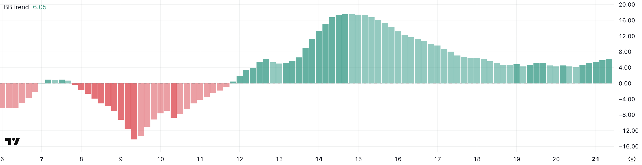 Solana (SOL) jatkaa vahvuutensa osoittamista monilla rintamilla, säilyttäen nousujohteisen rakenteen Ichimoku Cloud -kaaviossaan ja kasvattaen tunnelmaa keskeisissä markkinatunnusluvuissa. BBTrend-indikaattori on jälleen noussut, mikä viittaa uudistuneeseen ostopaineeseen lyhyen jäähtymisen jälkeen.