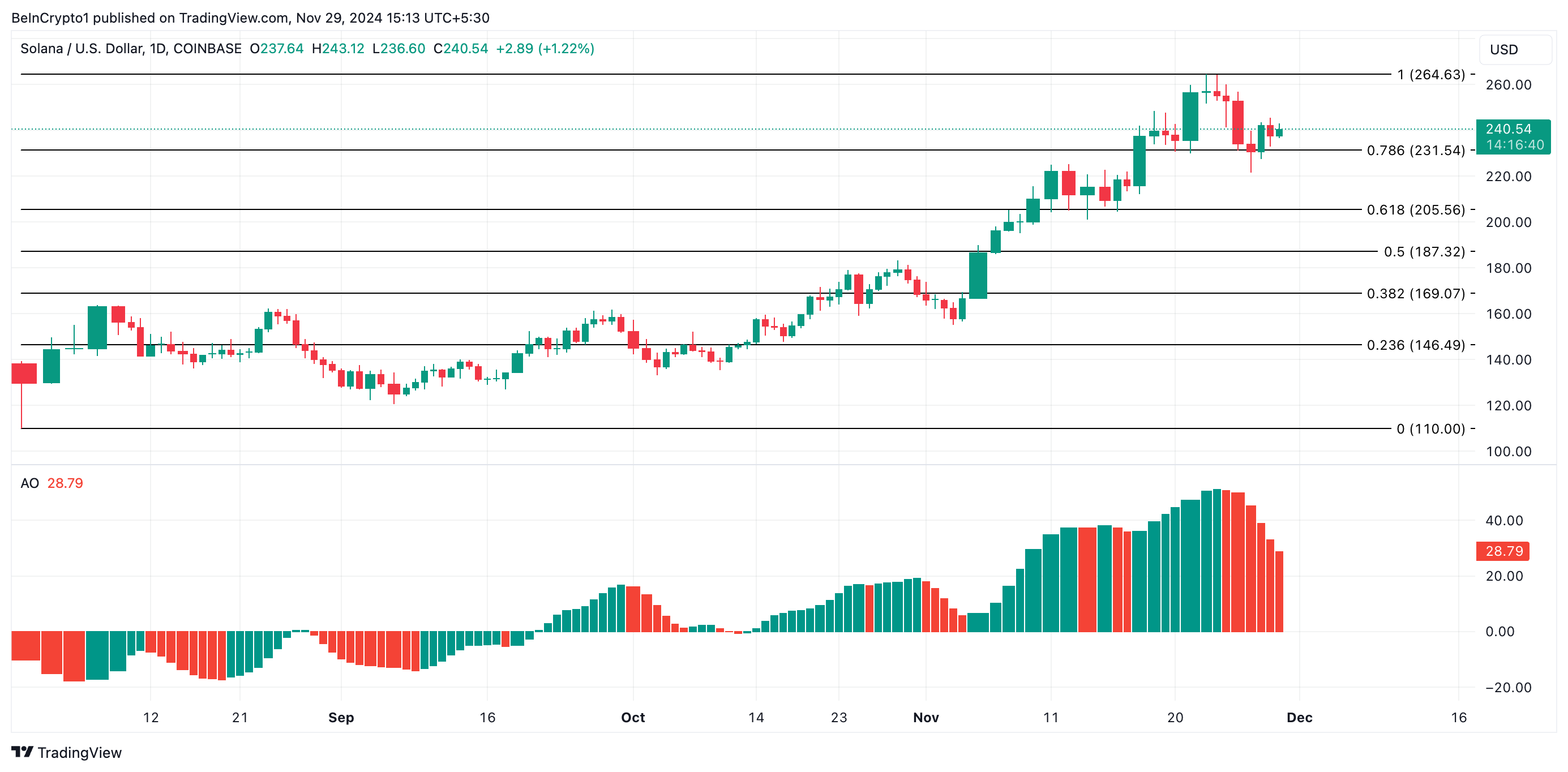 Solana (SOL) on ollut laskusuunnassa viime viikon aikana. Sen jälkeen kun se saavutti uuden kaikkien aikojen ennätyksen 264,63 dollarissa 22. marraskuuta, SOL on kohdannut myyntipaineen kasvua. Tämä on aiheuttanut sen hinnan laskun lähes 10 % viimeisen seitsemän päivän aikana.