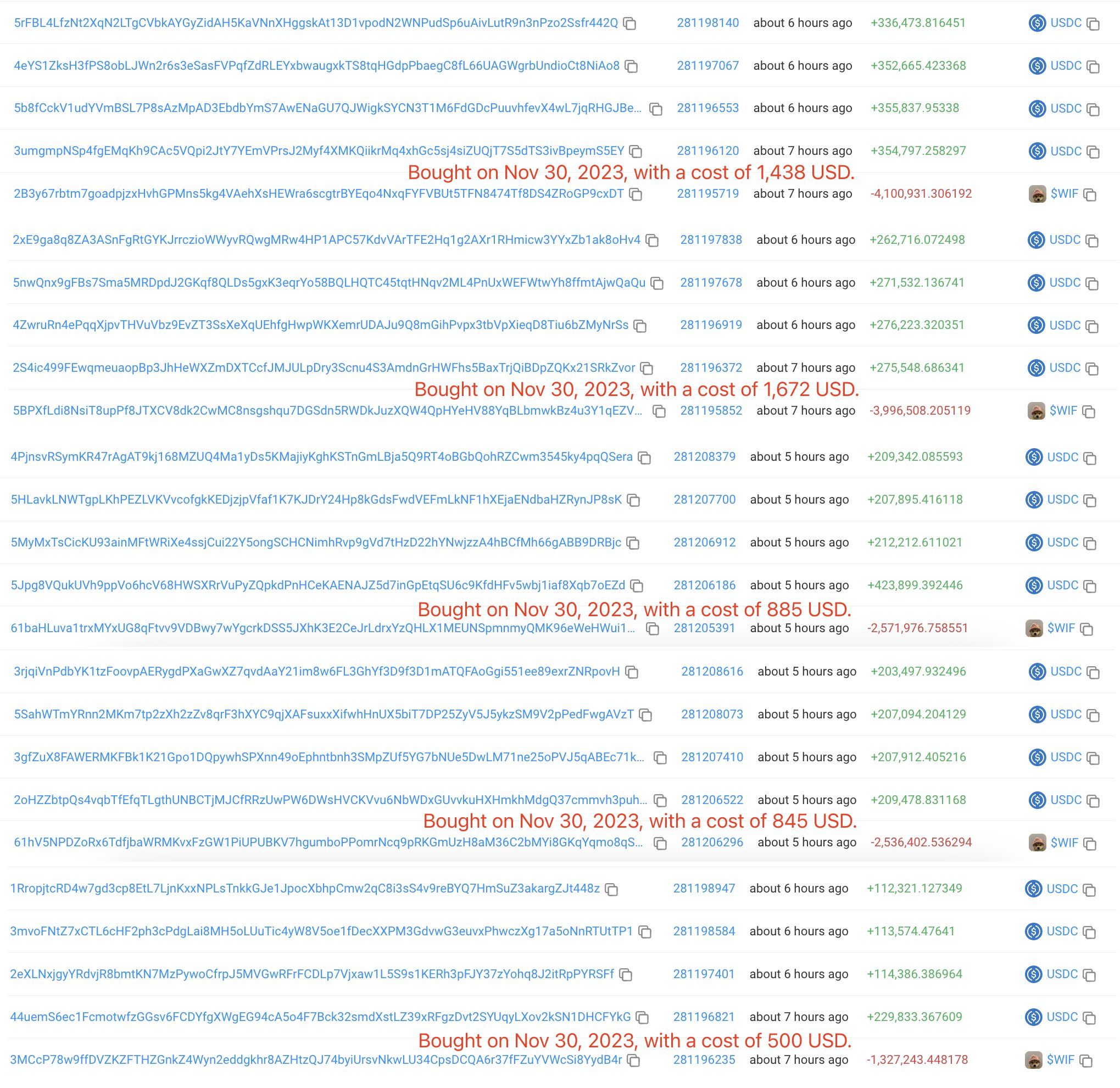 Kun useimmat meemikolikoiden kauppiaat suosivat nopeaa omaisuuden ostamista ja myymistä voittojen kirjaamiseksi, yksi WIF-omistaja päätti pelata pitkää peliä. Ketjuanalyysitilin Lookonchain mukaan kauppias myi suuren osan hankkimistaan WIF-omistuksista marraskuun 30. päivänä 2023.