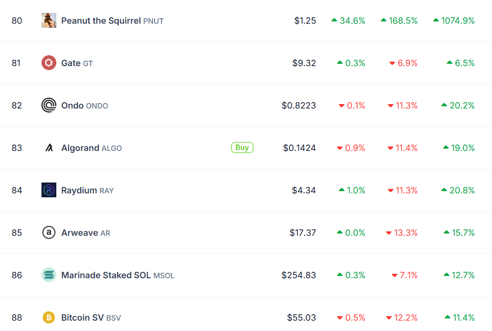 PNUT:n äskettäinen hintaralli on nostanut sen krypto-omaisuusvarojen top 100 -listalle markkina-arvon perusteella. Markkina-arvon noustua yli miljardiin dollariin, PNUT on jo ohittanut vakiintuneita tokeneita kuten Algorand (ALGO), Raydium (RAY) ja Bitcoin SV (BSV). Tokenin listaus Binance-pörssissä on edelleen vauhdittanut sen kasvua, tehden siitä saatavilla laajemmalle yleisölle ja vahvistaen sen markkinamomenttia.
