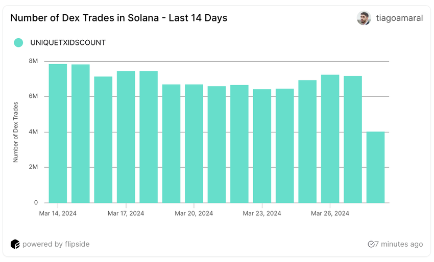 Merkittävä tapahtuma oli hajautetun pörssin (DEX ) transaktioiden ennennäkemätön päivittäinen volyymi, joka saavutti ennätykselliset 7,86 miljoonaa 14. maaliskuuta, mikä on uusi ennätys. Maaliskuun 14. päivästä lähtien Solanan DEX-kaupankäyntivolyymi ylitti jatkuvasti 6 miljoonaa transaktiota päivässä, mikä on jyrkkä kontrasti ajanjaksoon ennen joulukuuta 2023, jolloin päivittäiset transaktiovolyymit olivat korkeimmillaan 2,2 miljoonaa Solanan DEX:ssä.