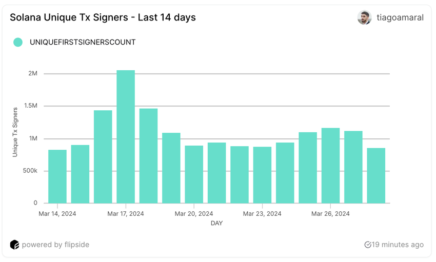 Solana rekisteröi 873 000 yksittäistä käyttäjää 23. maaliskuuta, ja määrä kasvoi 1,1 miljoonaan 27. maaliskuuta.