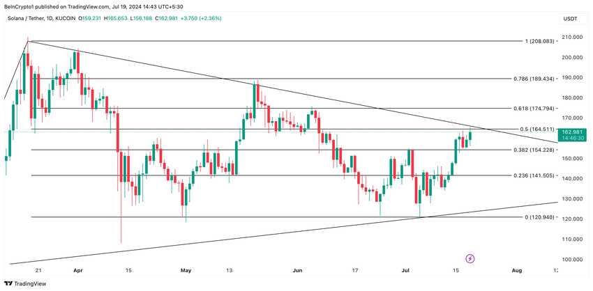 Jos tämä suuntaus jatkuu, SOL murtuu nousevan viirikuvion yläviivan yläpuolelle. Se vaihtaa omistajaa 164,51 dollarissa ja nousee kohti 170 dollaria.