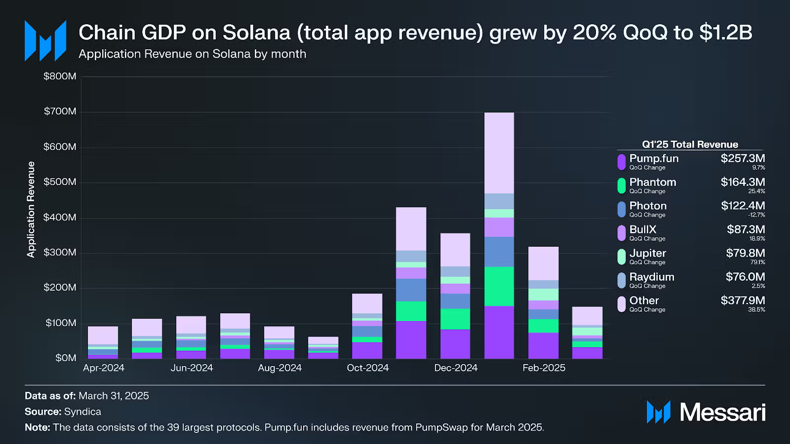Messarin raportin mukaan Solana (SOL) saavutti yhteensä 1,2 miljardin dollarin sovellustulot (Chain GDP) vuoden 2025 ensimmäisellä neljänneksellä. Tämä tulos merkitsee 20 %:n kasvua edelliseen neljännekseen verrattuna, jolloin tulot olivat 970,5 miljoonaa dollaria. Se on Solanan parhaiten suoriutunut neljännes viimeisen 12 kuukauden aikana, mikä osoittaa vahvaa ekosysteemin palautumista vuoden merkittävän volatiliteetin jälkeen.