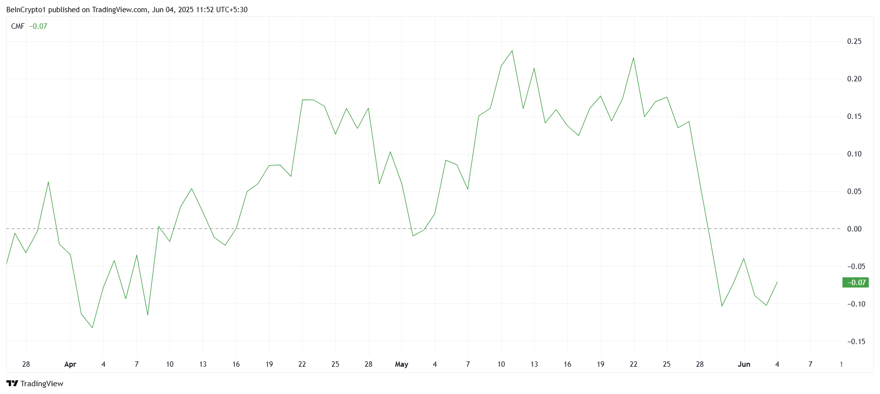 Kokonaisuudessaan Solanan tunnelma on ollut pääosin negatiivinen, ja keskeiset tekniset indikaattorit tukevat tätä näkymää. Chaikin Money Flow (CMF) on tällä hetkellä jumissa nollaviivan alapuolella, mikä osoittaa, että ulosvirtaukset hallitsevat sisäänvirtauksia. Tämä viittaa siihen, että myyntipaine on suurempi kuin ostokiinnostus.